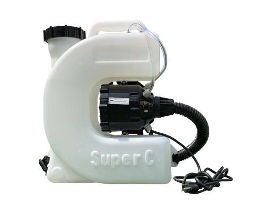 Super C Electric ULV Fogger frío son aplicadores ulv portátiles alimentados por un suministro eléctrico de CA de 220/110 voltios. Un confiable y potente motor de inducción de CA de alta velocidad eléctrica (31,000 RPM) y ventilador crean gotas de rociado muy pequeñas, en el rango de tamaño de gota de 20-50um, usando una boquilla de corte de aire vertical.